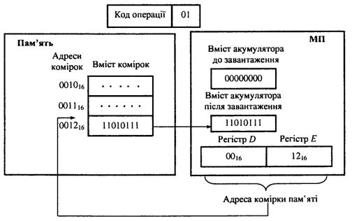 підлягає виконанню. Як приклад розглянемо команду МП i8080 прямого завантаження акумулятора вмістом комірки пам'яті, розміщеної за адресою 0012H. Формат та схему